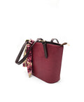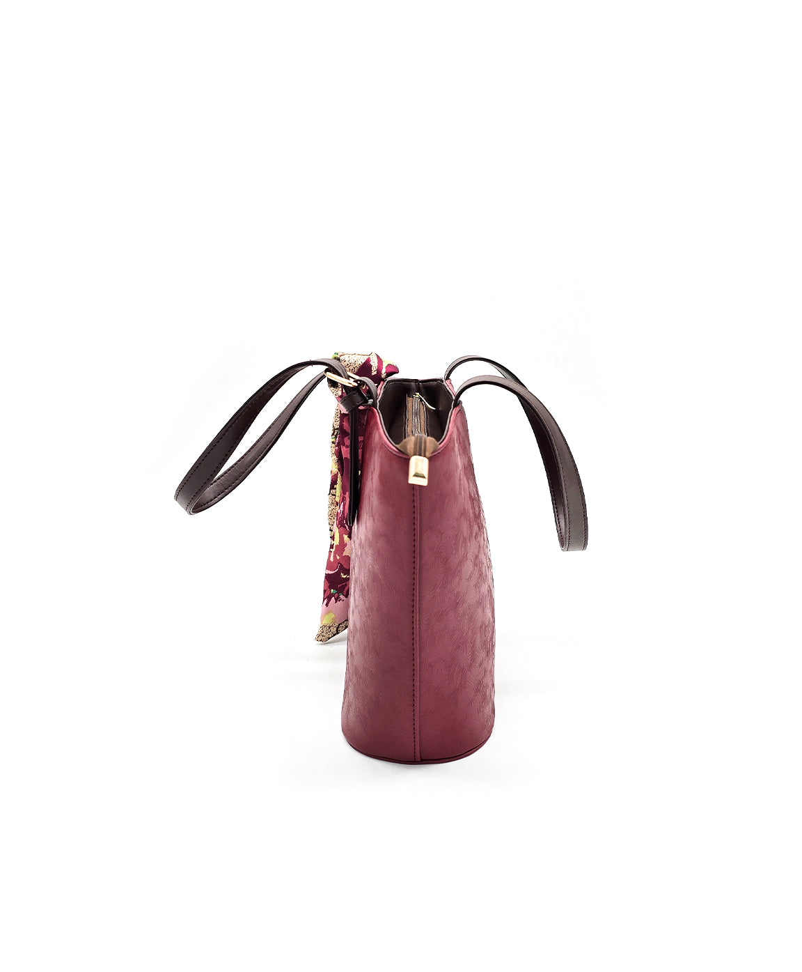 This tote bag showcases a structured trapezoid silhouette, giving it a polished and versatile shape. It's elongated handles provide comfort for both shoulder and hand carry, while a sleek buckle detail adds refinement. Finished with a draped scarf accent, it blends classic structure with a touch of effortless style.
