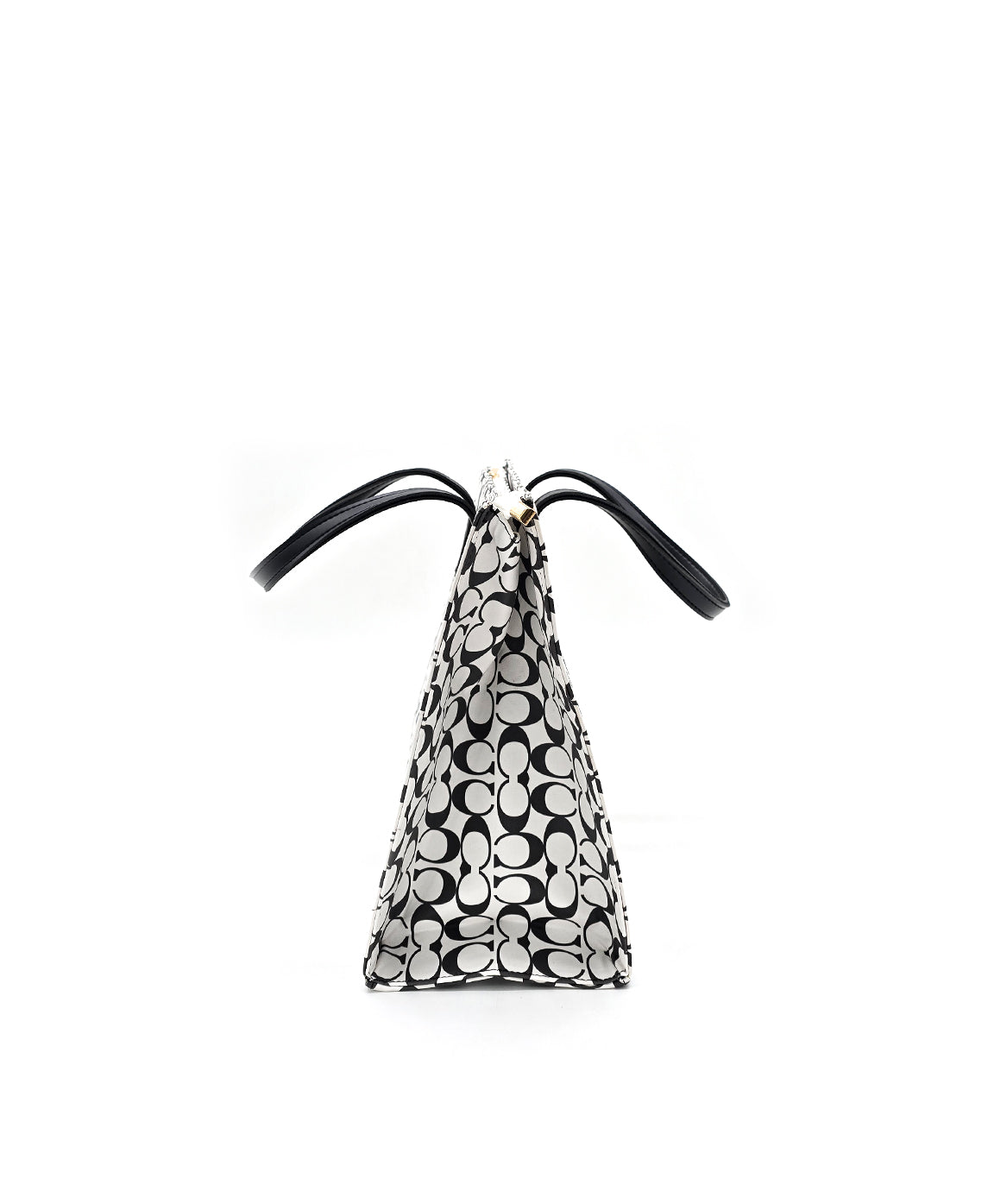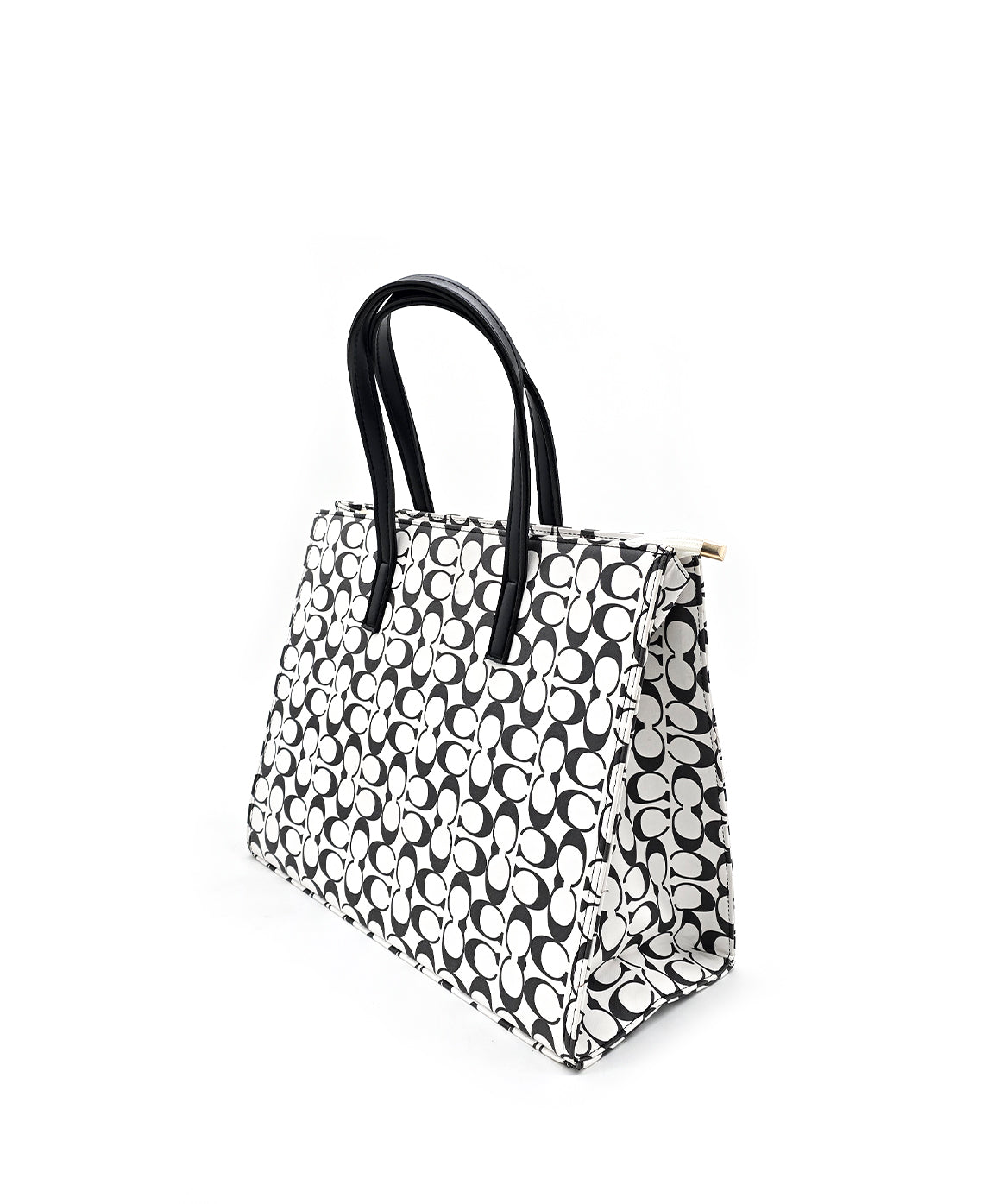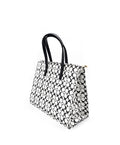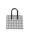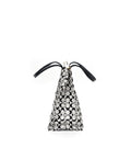 This tote bag is crafted with a structured, box-like silhouette that offers a modern and polished look. Its all-over patterned exterior adds visual interest, giving it a distinctive and stylish edge. Designed with sturdy top handles, it balances functionality with a refined, statement-making design.